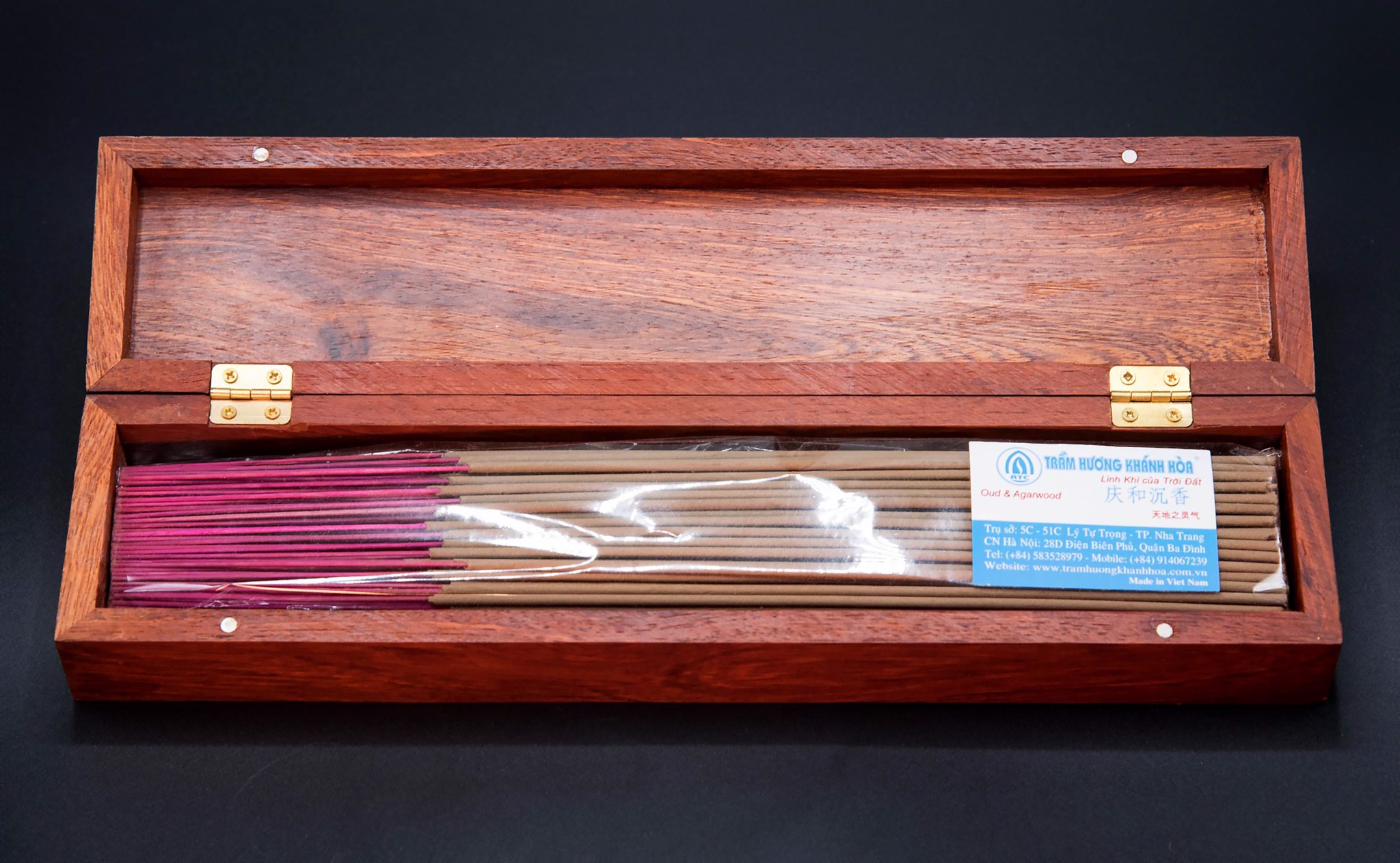 Hương trầm (nhang trầm) được để trong hộp làm bằng gỗ hương quý hiếm.